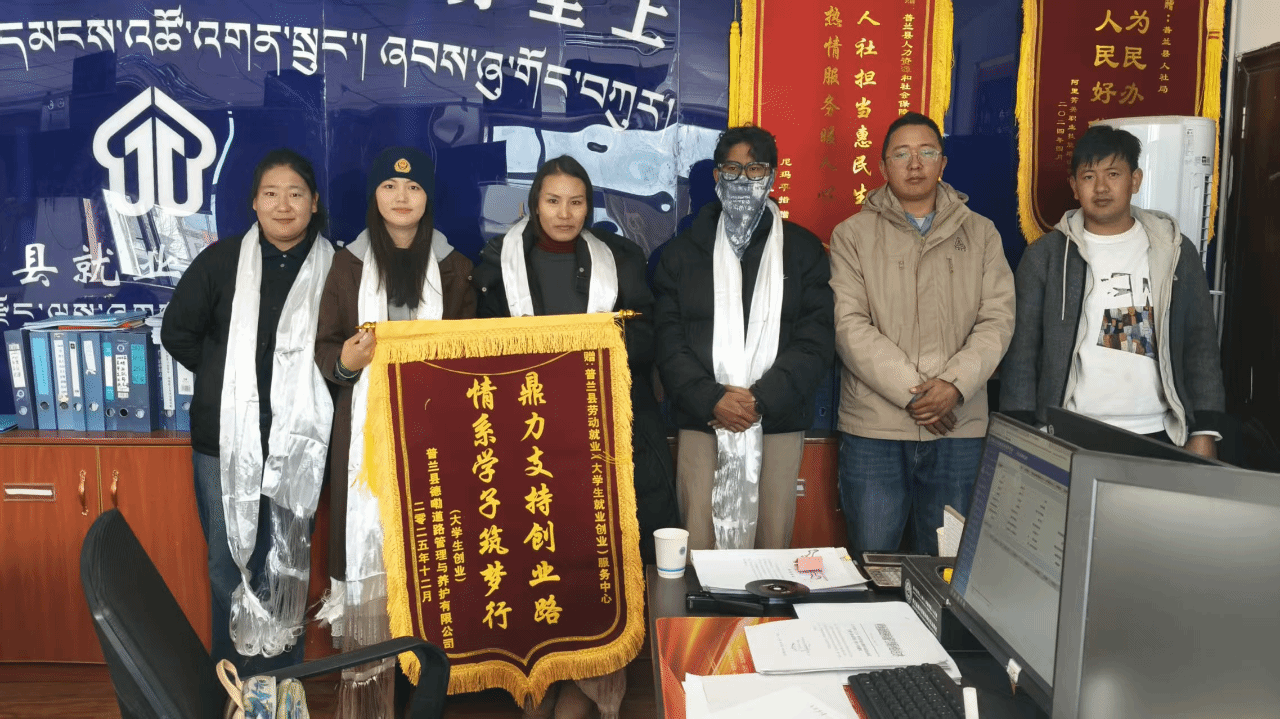 2020年,返乡大学生土旦列西创办普兰县乐农农业发展科贸有限公司,2023年企业因经营问题破产。普兰县人社局及时介入,通过政策解读、资源对接等方式为其提供全方位支持。2024年10月28日,土旦列西成立阿里地区普兰县德勒公路管理与养护有限公司,开启二次创业。为致谢帮扶,他向县劳动就业和学生就业创业服务中心赠送“鼎力支持创业路 情系学子筑梦行”锦旗。