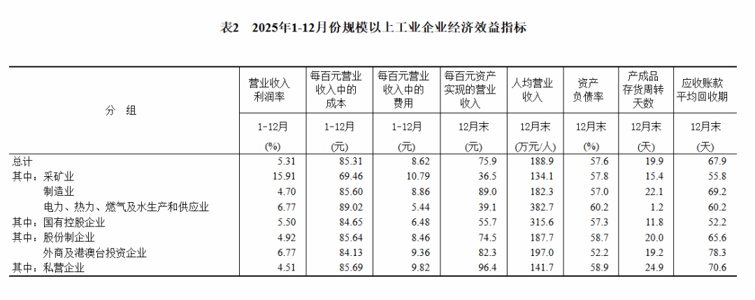 2025年末,规模以上工业企业每百元资产实现的营业收入为75.9元,比上年末减少2.7元;人均营业收入为188.9万元,比上年末增加5.5万元;产成品存货周转天数为19.9天,比上年末增加0.6天;应收账款平均回收期为67.9天,比上年末增加3.6天。