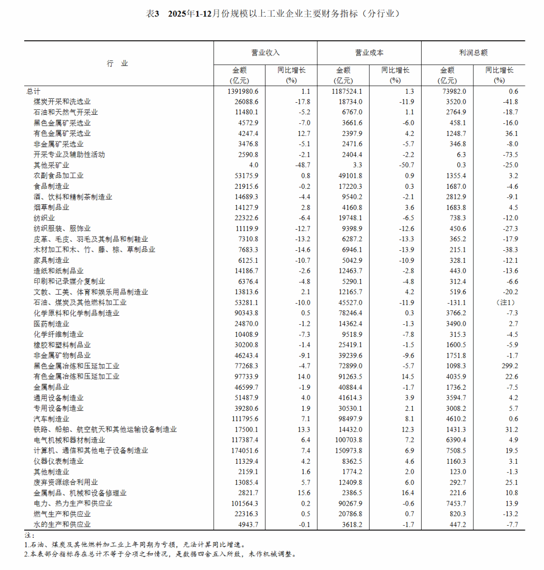 2025年,全国规模以上工业企业实现利润总额73982.0亿元,比上年增长0.6%(按可比口径计算,详见附注二)。