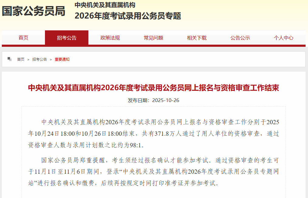 中央机关及其直属机构2026年度考试录用公务员网上报名与资格审查工作分别于2025年10月24日18:00和10月26日18:00结束,共有371.8万人通过了用人单位的资格审查,通过资格审查人数与录用计划数之比约为98:1。