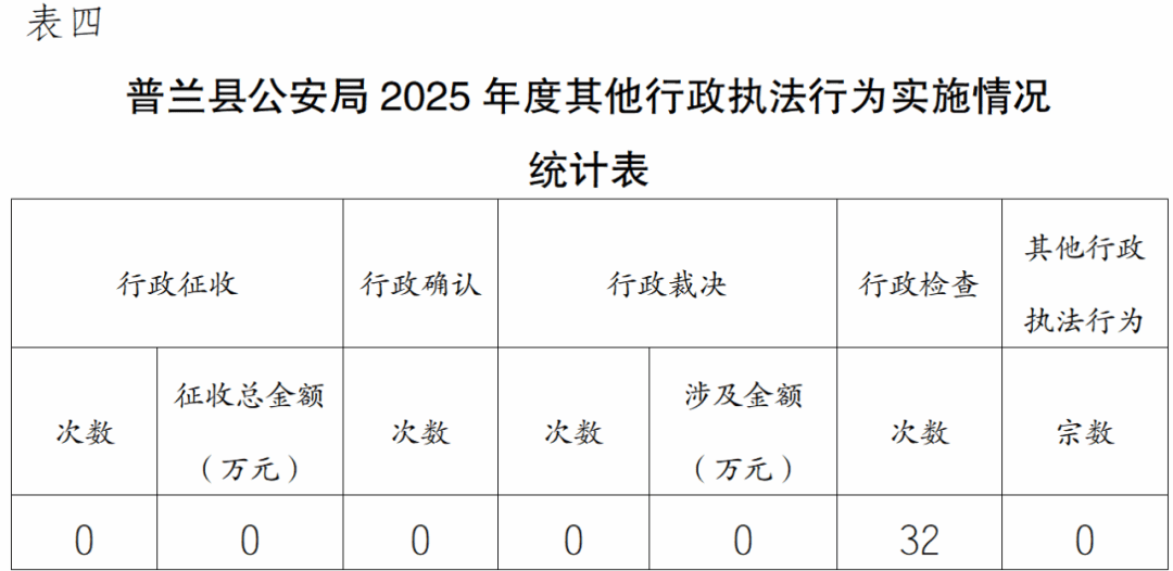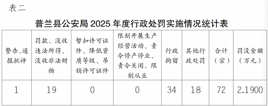 根据《国务院办公厅关于全面推行行政执法公示制度》规定,现将普兰县公安局2025年度行政执法统计报表公示如下: