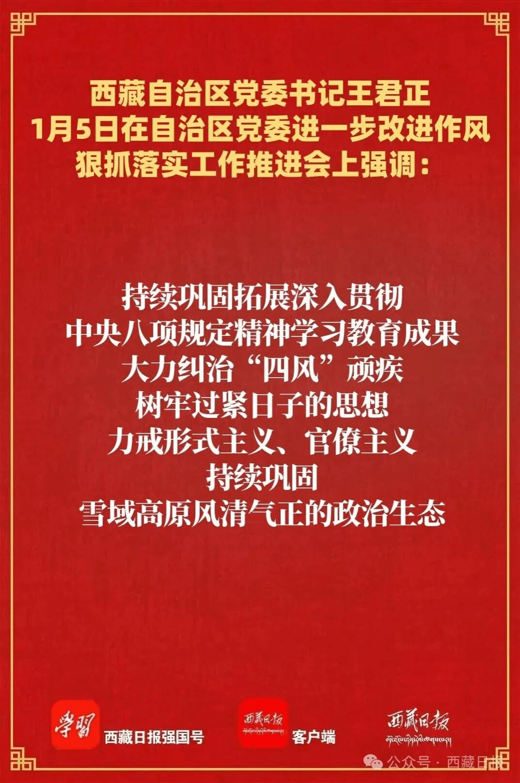 1月5日,自治区党委进一步改进作风狠抓落实工作推进会在拉萨召开。自治区党委书记王君正出席并讲话。他强调,要认真贯彻落实习近平总书记关于加强党的作风建设、西藏工作的重要指示和新时代党的治藏方略,深入改进工作作风,优化完善落实机制,不断推进作风建设常态化长效化,确保党中央决策部署在西藏得到坚决贯彻落实。