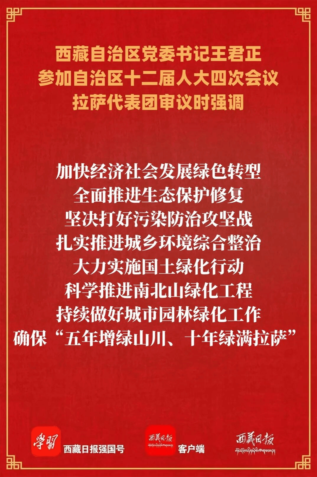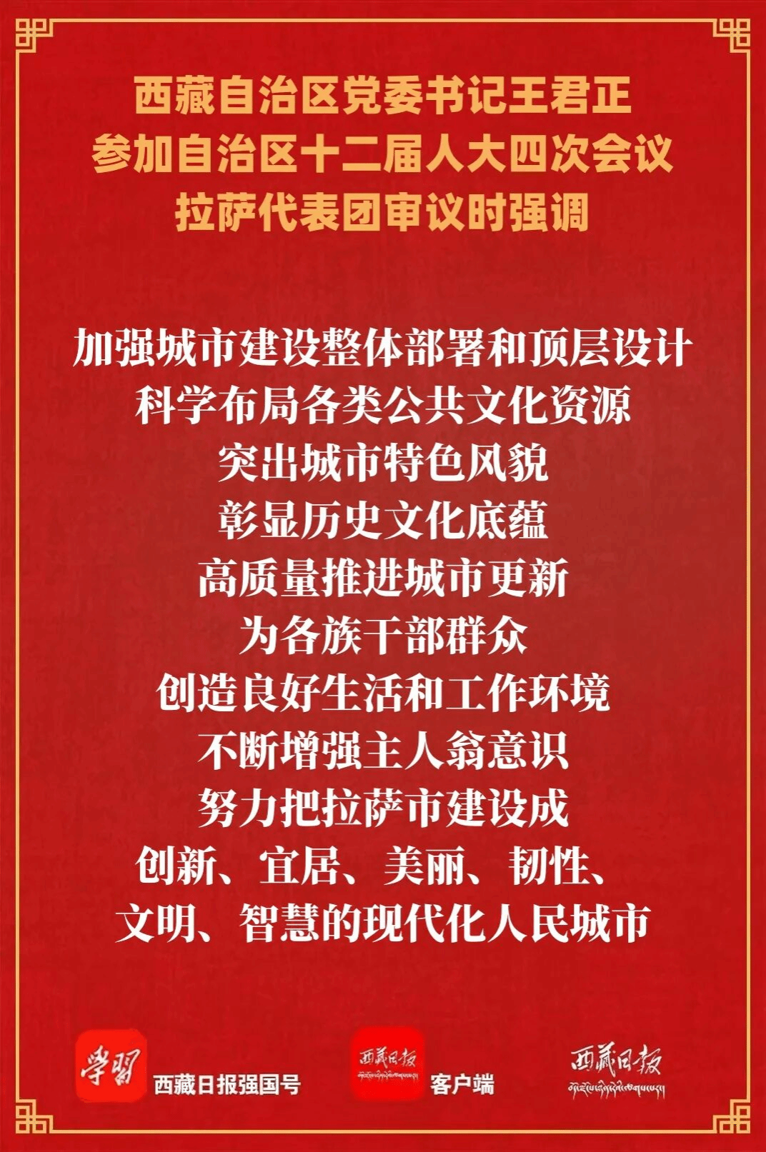 131日,自治区党委书记王君正参加他所在的自治区十二届人大四次会议拉萨代表团审议时强调,要全面深刻准确贯彻落实党的二十届四中全会精神,深入贯彻习近平总书记关于西藏工作的重要指示和新时代党的治藏方略,为“十五五”开好局起好步当好全区长治久安和高质量发展排头兵,努力为社会主义现代化新西藏建设作出更大贡献。