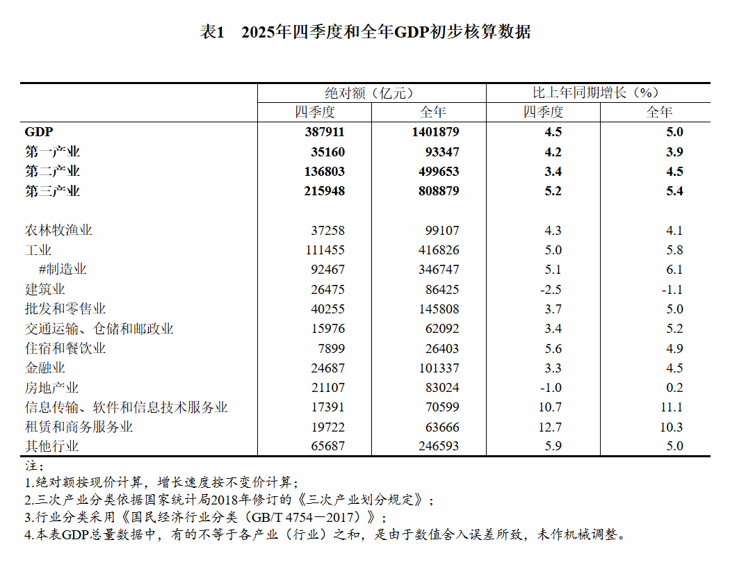 【数据发布】2025年四季度和全年国内生产总值初步核算结果