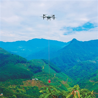 云南红河哈尼族彝族自治州河口瑶族自治县老范寨乡无人机正在运送芒果。
