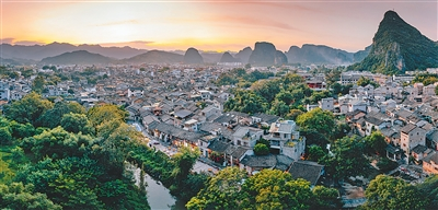 沉浸在暮色里的广西贺州市黄姚古镇景区。