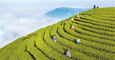 茶农在四川泸州市纳溪区护国镇德红村红岩子茶园采摘茶叶。
