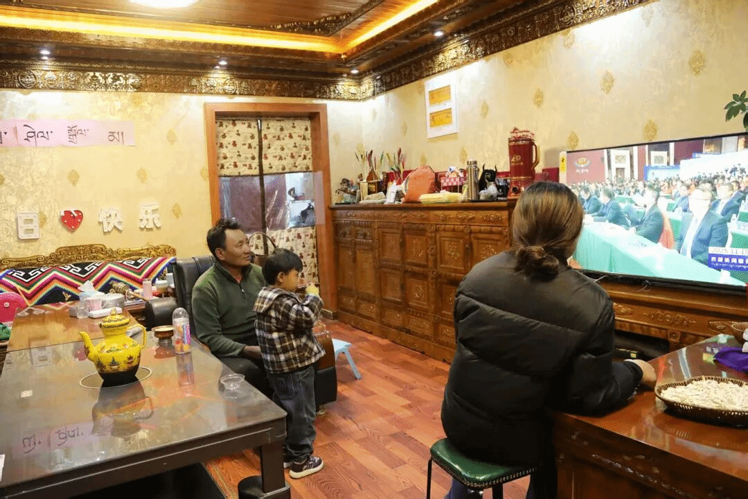 在安置点的另一头,努布家的日子同样过得有滋有味。推开虚掩的院门,院子里晾晒的藏毯透着阳光的味道。走进客厅,浅色的实木家具擦得一尘不染,电热炉上的水咕嘟冒着热气,暖意融融。努布和家人正看着电视,荧幕里播放着西藏新闻联播。“以前住土坯房,冬天烧牛粪取暖,晚上看电视还得靠太阳能发电,信号时好时坏。”努布笑着说,“现在不一样了,水电稳定,家具都是新的,这日子才叫有品质,真正从‘有房住’变成了‘住得好’。”