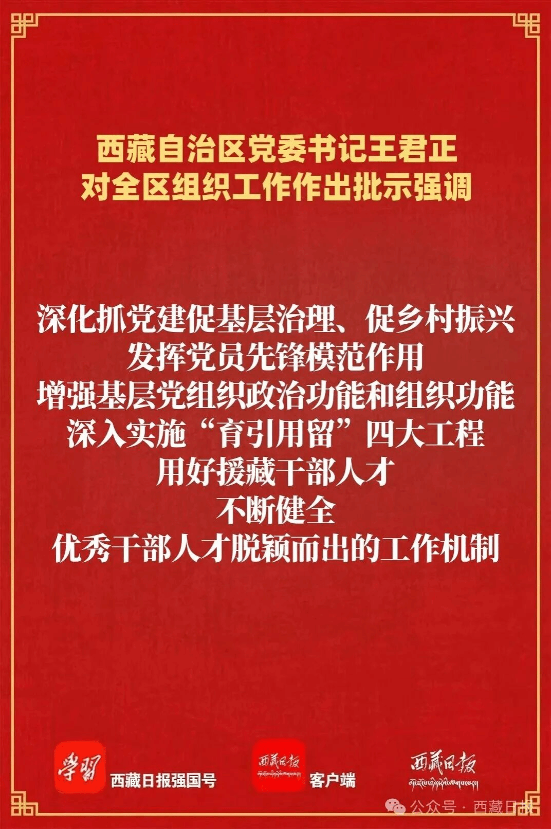 王君正在批示中指出,2025年,全区各级组织部门深入学习贯彻习近平总书记关于党的建设的重要思想、关于党的自我革命的重要思想、关于西藏工作的重要指示和新时代党的治藏方略,坚持组织路线服务政治路线,开展深入贯彻中央八项规定精神学习教育,凭能力用干部、以实绩论英雄,以考促干、以考选人,扎实做好组织系统各项工作,为推动西藏长治久安和高质量发展提供了坚强组织保证。