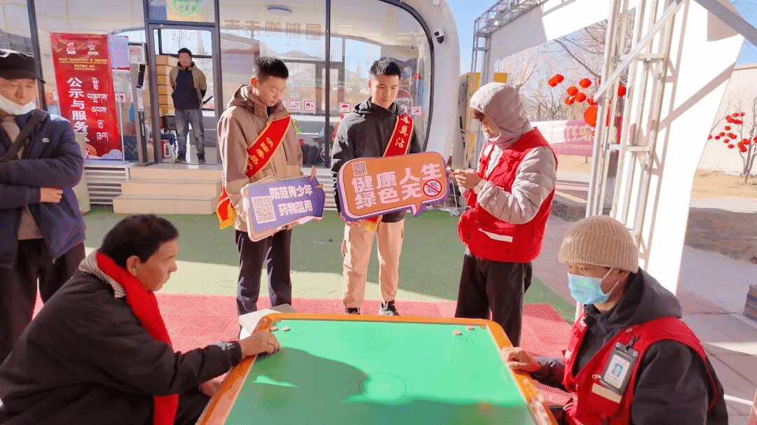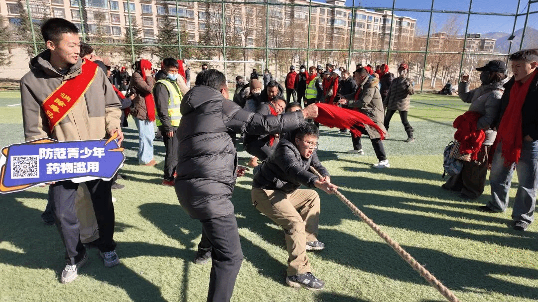 活动现场洋溢着浓厚的节日氛围,拔河比赛、藏式骰子、藏式克朗球等西藏传统民族体育项目和翻滚桶接力赛、袋鼠跳接力赛等趣味体育赛事吸引了众多参与者。区市两级禁毒办在活动区域设置了专门的宣传点,通过展示仿真毒品模型和AI禁毒语音展板,向群众普及禁毒知识,特别是针对各类新型毒品和未列管成瘾性物质的危害进行了重点讲解,通过直观的展示和互动体验,帮助广大群众识别毒品伪装,了解依托咪酯、笑气、丁烷、替来他明等成瘾性物质的危害。“体育+禁毒”的宣传模式得到了现场群众的积极反响。大家表示,这种寓教于乐的方式既接受了健康生活的理念,又学到了实用的禁毒知识,为新春佳节增添了一份特殊的意义。