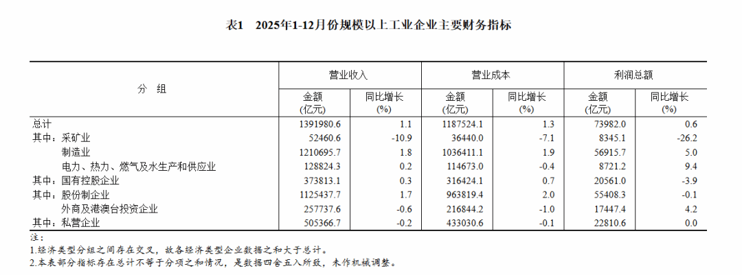 2025年,全国规模以上工业企业实现利润总额73982.0亿元,比上年增长0.6%(按可比口径计算,详见附注二)。