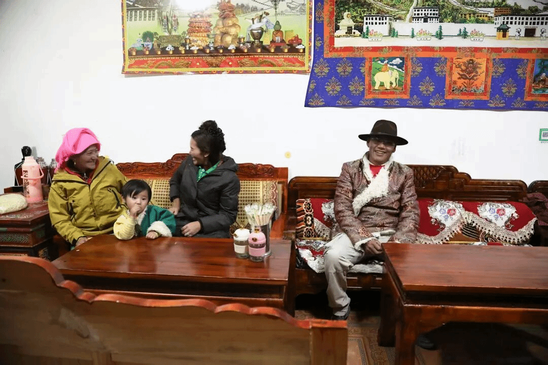 在安置点的另一头,努布家的日子同样过得有滋有味。推开虚掩的院门,院子里晾晒的藏毯透着阳光的味道。走进客厅,浅色的实木家具擦得一尘不染,电热炉上的水咕嘟冒着热气,暖意融融。努布和家人正看着电视,荧幕里播放着西藏新闻联播。以前住土坯房,冬天烧牛粪取暖,晚上看电视还得靠太阳能发电,信号时好时坏。努布笑着说,现在不一样了,水电稳定,家具都是新的,这日子才叫有品质,真正从有房住变成了住得好
