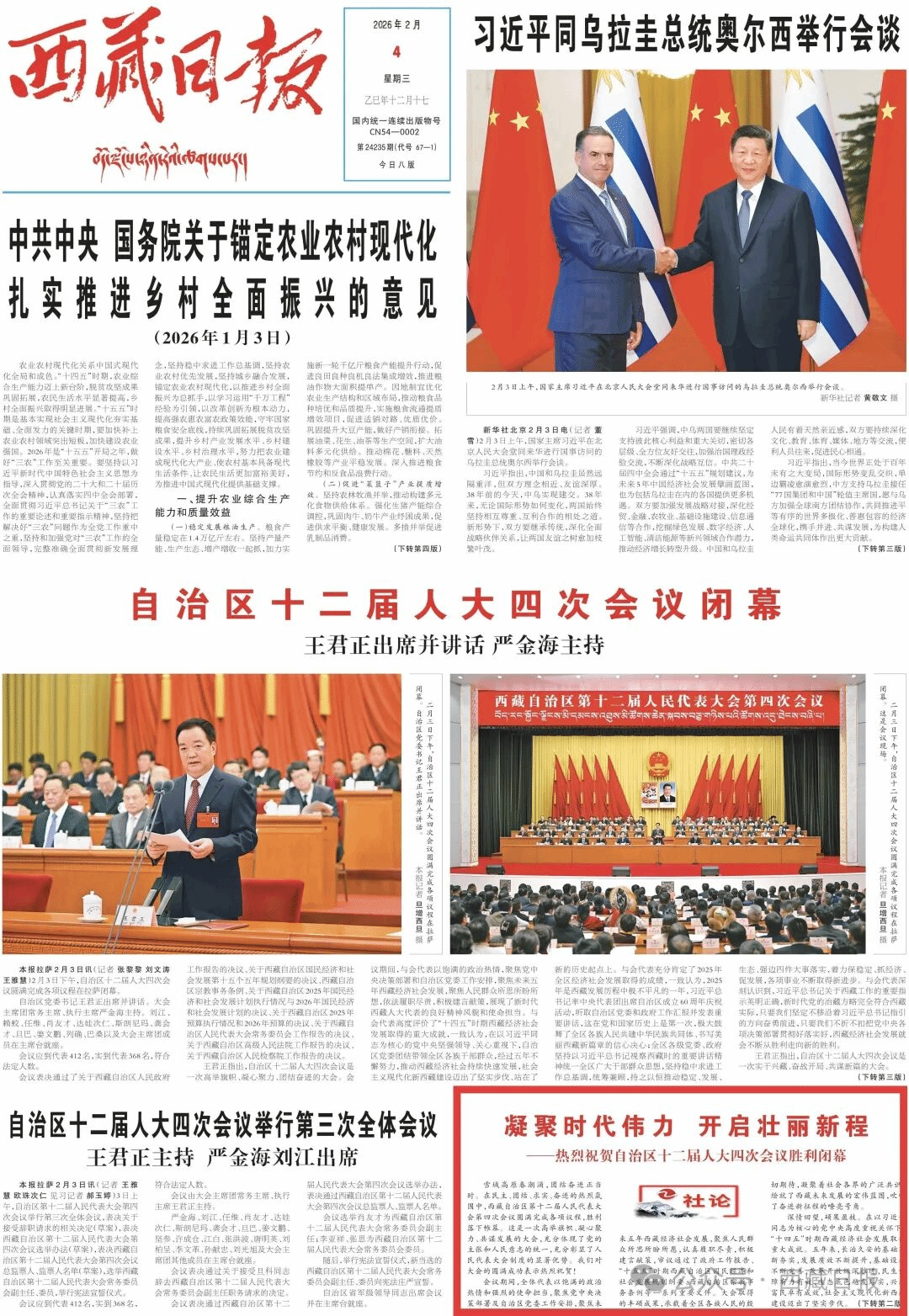 对此,西藏日报刊发两篇社论:《凝聚时代伟力 开启壮丽新程——热烈祝贺自治区十二届人大四次会议胜利闭幕》《共商开新局 同心启新程——热烈祝贺自治区政协十二届四次会议胜利闭幕》