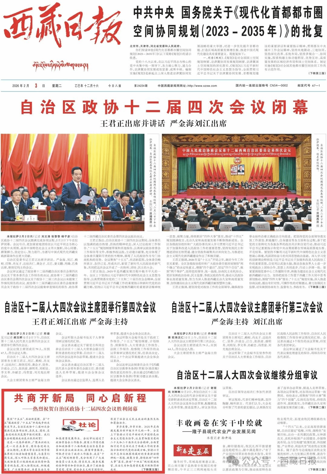 西藏自治区第十二届人民代表大会第四次会议、政协第十二届西藏自治区委员会第四次会议圆满完成各项议程,分别于2月3日、2月2日在拉萨胜利闭幕。