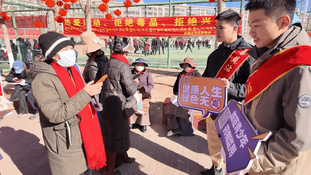 活动现场洋溢着浓厚的节日氛围,拔河比赛、藏式骰子、藏式克朗球等西藏传统民族体育项目和翻滚桶接力赛、袋鼠跳接力赛等趣味体育赛事吸引了众多参与者。区市两级禁毒办在活动区域设置了专门的宣传点,通过展示仿真毒品模型和AI禁毒语音展板,向群众普及禁毒知识,特别是针对各类新型毒品和未列管成瘾性物质的危害进行了重点讲解,通过直观的展示和互动体验,帮助广大群众识别毒品伪装,了解依托咪酯、笑气、丁烷、替来他明等成瘾性物质的危害。“体育+禁毒”的宣传模式得到了现场群众的积极反响。大家表示,这种寓教于乐的方式既接受了健康生活的理念,又学到了实用的禁毒知识,为新春佳节增添了一份特殊的意义。