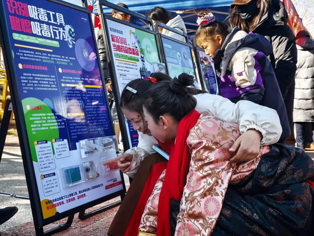 民警为群众讲解毒品仿真样品并发放禁毒知识读本