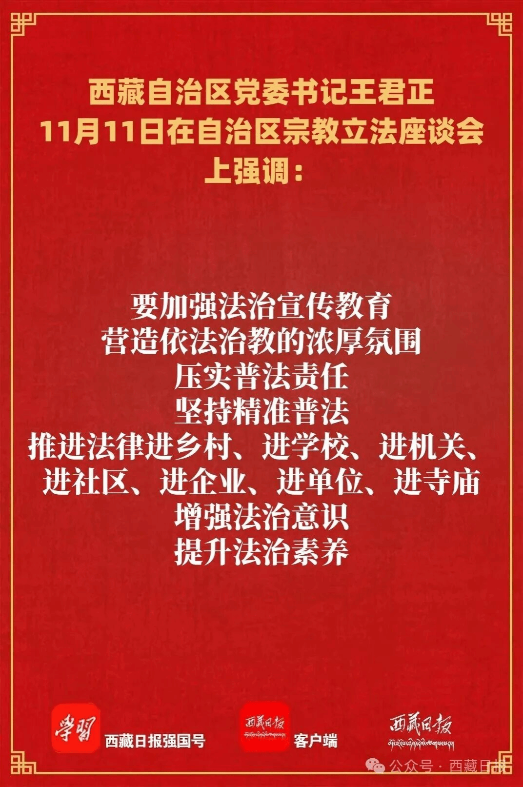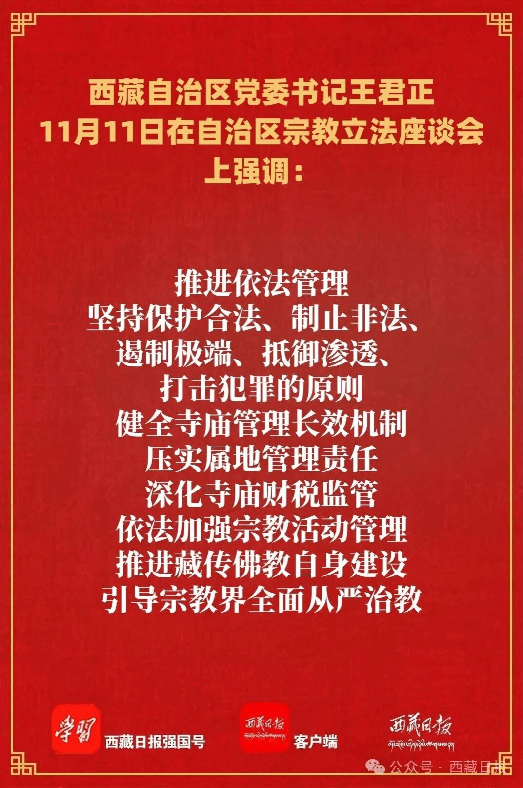 1111日,自治区党委书记王君正主持召开自治区宗教立法座谈会,听取有关立法工作意见建议。他强调,要深入贯彻落实习近平总书记关于宗教工作、西藏工作的重要指示和新时代党的治藏方略,扎实推进中华民族共同体建设,积极引导藏传佛教与社会主义社会相适应,不断提升宗教事务治理法治化水平,为西藏长治久安和高质量发展作出新贡献。严金海汇报有关立法工作起草情况,刘江参加。