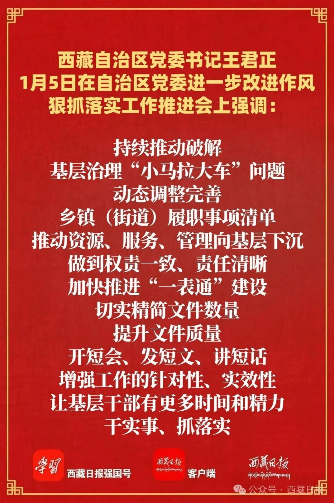要坚持问题导向、深入整改,持续整治形式主义为基层减负。坚持从实际出发科学决策,着力纠治急功近利、盲目决策问题,确保各项工作安排符合党中央要求、符合西藏实际、符合群众期盼。持续推动破解基层治理小马拉大车问题,动态调整完善乡镇(街道)履职事项清单,推动资源、服务、管理向基层下沉,做到权责一致、责任清晰。加快推进一表通建设,切实精简文件数量,提升文件质量,开短会、发短文、讲短话,增强工作的针对性、实效性,让基层干部有更多时间和精力干实事、抓落实。
